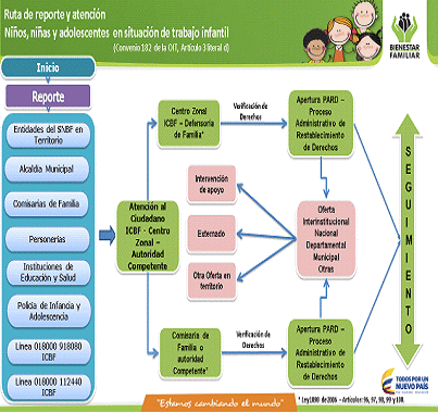 La siguiente ruta de reporte y atención a los niños, niñas y adolescentes en situación de trabajo infantil está fundamentada en la definida para el Lineamiento técnico administrativo de ruta de actuaciones para el restablecimiento de derechos de niños, niñas y adolescentes con sus derechos inobservados, amenazados o vulnerados, la cual ha sido ajustada con el propósito de ser reconocida por los diferentes agentes y entidades del Sistema Nacional de Bienestar Familiar – SNBF, responsables en territorio del restablecimiento de derechos.