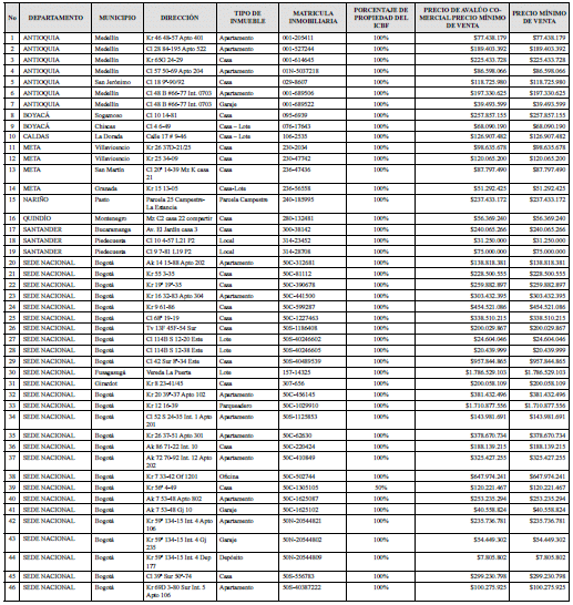 Que el Comité de Gestión de Bienes de la Sede de la Dirección General, en sesión virtual 002 del 7 de abril de 2020, consideró viable y recomendó la inclusión de dos (2) inmuebles en el Plan de Enajenación Onerosa de la Entidad, estableciendo su valor mínimo de venta con base en el avalúo comercial vigente, por no ser viables para el desarrollo de programas misiones de la Entidad, de conformidad con el análisis de utilidad realizado a cada uno. Dicha decisión se encuentra contenida en el Acta del citado Comité.