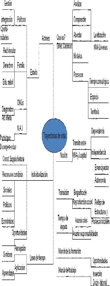 “La noción de trayectorias, nos remite al transito desde una situación de dependencia (infancia) a una situación de emancipación o autonomía social, transito que se ha modificado, principalmente, por el alargamiento de la condición de estudiante en el tiempo y el retraso en la inserción laboral y de autonomías de emancipación social de los adolescentes y jóvenes”.[8]