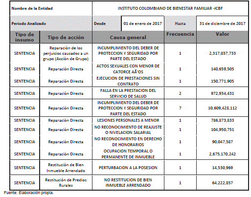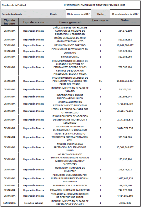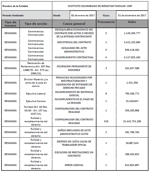 Paso número 1- Identificación de la Actividad Litigiosa: Se elaboró con los datos enviados por las 33 oficinas desconcentradas del ICBF denominadas Direcciones Regionales, respecto de los procesos donde el Instituto Colombiano de Bienestar Familiar intervino judicial y extrajudicialmente como demandados, en el período comprendido entre el 1 de enero de 2017 y el 31 de diciembre de 2017, teniendo en cuenta el tipo de proceso, la frecuencia y el valor de las pretensiones y/o condenas.
