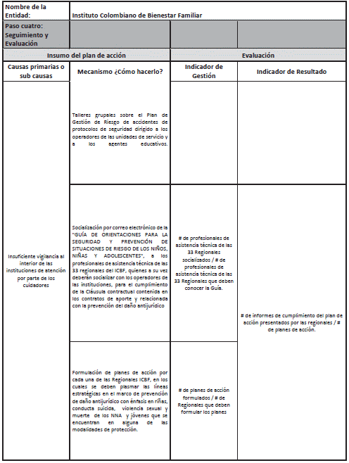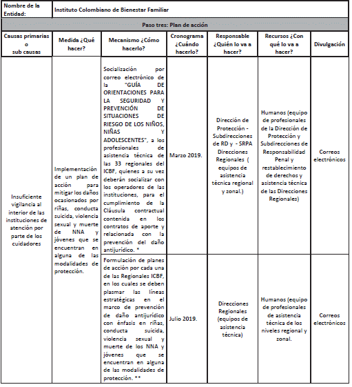 1. Los planes de acción deben ser claros en las situaciones y acciones o estrategias para prevenir el riesgo de suicidio, muertes por evasiones, lesiones por quemaduras, muerte por ahogamiento, abuso sexual, lesiones o muertes por riñas entre los adolescentes y/o jóvenes. Los planes de acción deben ser claros en las acciones preventivas de acuerdo con el riesgo y competencias de otros actores.