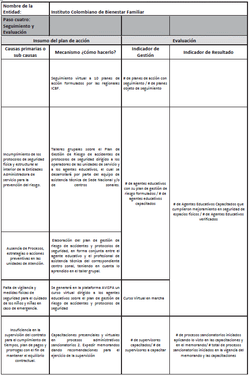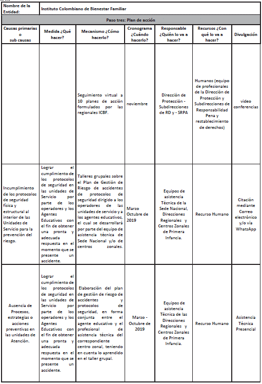 Para evitar la ocurrencia de los hechos generadores de reclamaciones al INSTITUTO COLOMBIANO DE BIENESTAR FAMILIAR en virtud de hechos de violencia sexual, lesiones o muerte y de otros daños a menores de edad que están bajo su protección, es preciso atacar las causas que originan tales hechos, mediante la elaboración de estrategias, que permitan lograr el cumplimiento de los protocolos de seguridad en el hogar comunitario por parte de los operadores para además, obtener una pronta y adecuada reacción del agente educativo en caso de emergencia, lo cual se realizará a través de la realización de Talleres grupales sobre el Plan de Gestión de Riesgo de accidentes de protocolos de seguridad dirigido a los operadores de las unidades de servicio y a los agentes educativos, el cual se desarrollará por parte del equipo de asistencia técnica de Sede Nacional y/o de Centros Zonales, lo cual le permitirá a los agentes educativos: