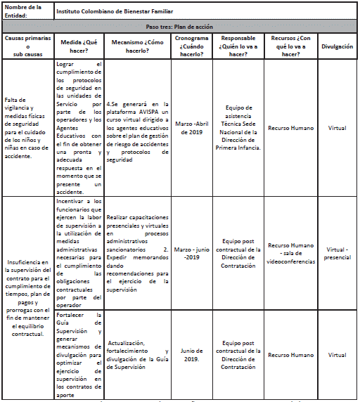 Paso número 3- Plan de Acción: Una vez definidas con las áreas misionales y de apoyo, las causas generadoras del daño se determinaron cuáles se pueden prevenir, definiéndose unas medidas preventivas (Qué hacer), cómo hacerlo (Mecanismo), el período en el cual se puede lograr (Cronograma), el área encargada de la medida de prevención (Responsable), los recursos que se requerirán (Con qué lo va a hacer) y la forma de dar a conocer la Política diseñada (Divulgación).