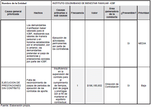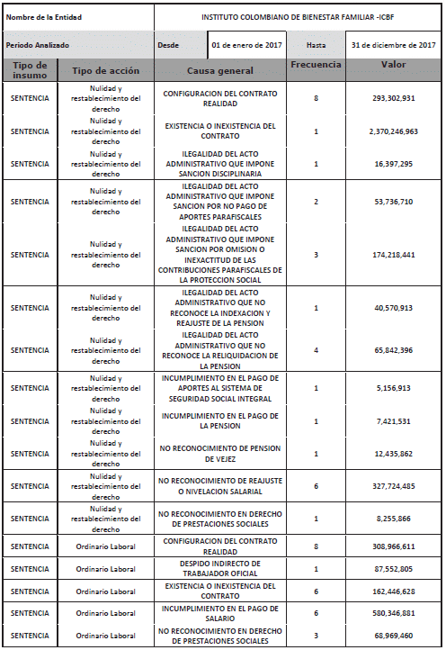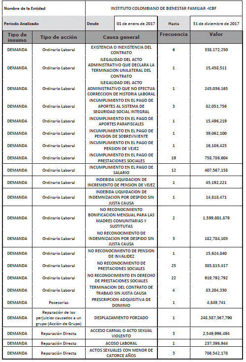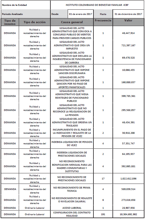 El cuadro que se expone a continuación refleja los resultados a nivel nacional referente al tipo de insumo (conciliación, demanda o condena), tipo de acción (medio de control), la causa general (hechos que dieron origen), la frecuencia en el periodo trabajado y el valor reconocido.