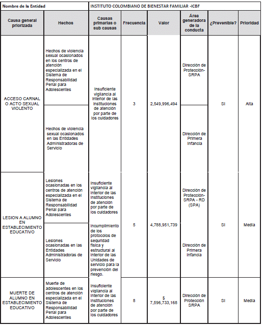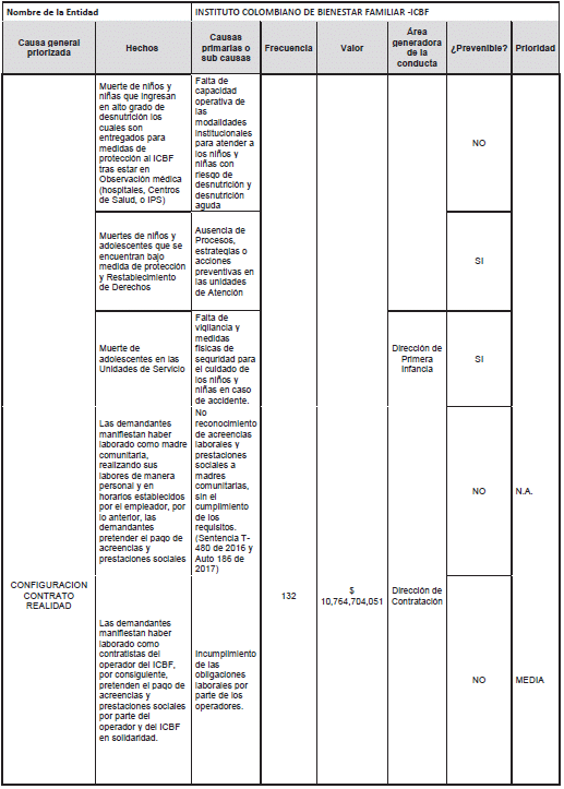 Paso número 2- Análisis de las Causas Primarias: Con la actividad litigiosa del Instituto, se realizó una priorización de las causas que acaecían con mayor frecuencia y/o valor reconocido, identificando las posibles causas primarias, previstas de acuerdo con el impacto para el Instituto y según la evolución de la Política de Prevención del Daño Antijurídico del ICBF, el área generadora o a cargo, definiendo además si es prevenible o no la causa y la prioridad que se le dará a la Prevención del daño.