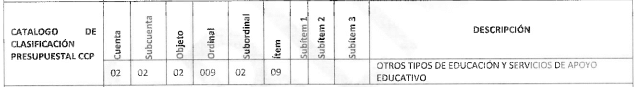 | CLASIFICADOR DEL GASTO | Rubro C4102-1500-19-0-4102020-02 02-02-02-009-02-09 OTROS TIPOS DE EDUCACIÓN Y SERVICIOS DE APOYO EDUCATIVO Corresponde a la adquisición de un servicio con personas naturales o jurídicas que desarrollen las acciones necesarias para cumplir con la prestación del servicio, que incluye: - Talento Humano, Coordinador General, Asesor metodológico, Orientador Psicosocial, Inspiradores, Auxiliar Administrativo. Estos cargos pueden variar de acuerdo con el esquema operativo y de cofinanciación. - Transporte talento humano y beneficiarios para asistir a las actividades de la estrategia de movilización. - Materiales para encuentros presenciales y no presenciales, estrategias de movilización social y de divulgación pedagógica, se establecen de acuerdo con la propuesta metodológica. - Refrigerios para encuentros presenciales y no presenciales y estrategias de movilización social y de divulgación pedagógica. - Alquiler de espacios y equipos. - Impresos y documentos. - Sistematización de experiencias (talento humano, transporte, conectividad, telefonía, papelería, logística). - Material de identificación Chaleco, gorra, carné para el talento humano, pendón, piezas comunicativas). - Otros gastos: gastos administrativos y financieros (conectividad, telefonía, papelería, logística, acceso y mantenimiento de bases de datos, entre otros relacionados con la prestación del servicio). | |