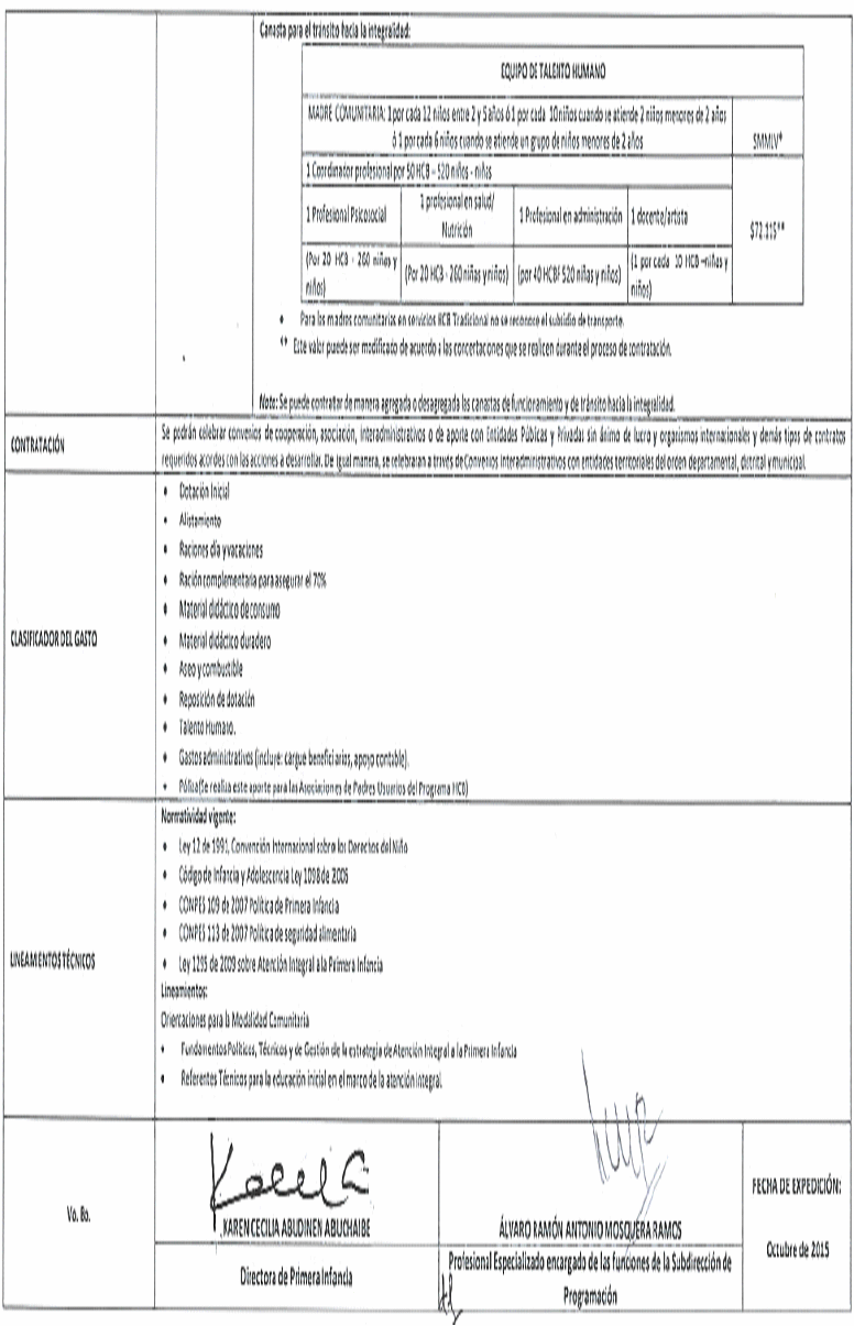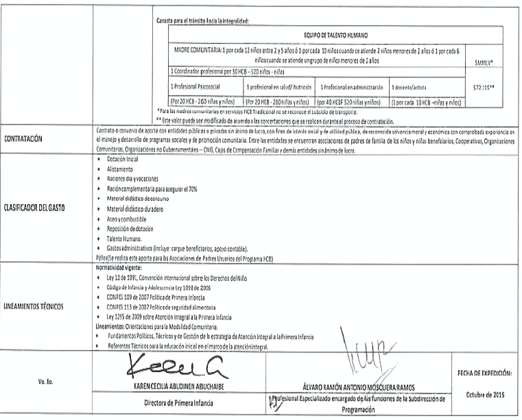 Vo. Bo. | KAREN CECILIA ABUDINEN ABUCHAIBE Directora de Primera Infancia | ALVARO RAMÓN ANTONIO MOSQUERA RAMOS Profesional Especializado encargado de las funciones de la Subdirección de Programación | FECHA DE EXPEDICIÓN: Octubre de 2015 | |