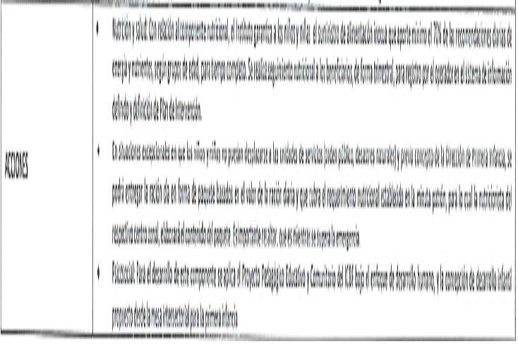 ACCIONES | - Nutrición y salud. Con relación al componente nutricional, el Instituto garantiza a los niños y niñas el suministro de aumentación inocua que aporte mínimo el 70% de las recomendaciones dianas de energía y nutrientes, según grupos de edad, para tiempo completo. Se realiza seguimiento nutricional a los beneficiarios, de forma trimestral, para registro por el operador en el sistema de información definido y definición de Plan de Intervención. - En situaciones excepcionales en que los niños y niñas no puedan desplazarse a las unidades de servicios (orden público, desastres naturales) y previo concepto de la Dirección de Primera Infancia, se podrá entregar la ración día en forma de paquete basados en el valor de la ración diaria y que cubra el requerimiento nutricional establecido en la minuta patrón, para lo cual la nutricionista del respectivo centro zonal, elaborará el contenido del paquete. Es importante resaltar, que es mientras se supera la emergencia. - Psicosocial: Para el desarrollo de este componente se aplica el Proyecto Pedagógico Educativo y Comunitario del ICBF bajo el enfoque de desarrollo humano, y la concepción de desarrollo infantil en el marco de los referentes técnicos para la educación inicial en el marco de la atención integral. - Familia y Comunidad: Los hogares Comunitarios de Bienestar, contemplan el trabajo con padres de familia, centrado en el desarrollo de competencias para el cuidado, la protección y el desarrollo de sus hijos e hijas, los padres de familia constituyen biológica y socialmente los soportes y significaciones más importantes en el desarrollo del vínculo afectivo y del proceso de socialización de los niños y niñas, razón por la cual es fundamental desarrollar con ellos procesos de formación que les ayuden a poner en práctica contenidos básicos para el desarrollo psíquico, afectivo y físico tendiente a lograr que el niño y la niña crezcan en relaciones de ética y responsabilidad consigo mismo, con los demás y con el mundo que les rodea. - Coordinación del SNBF. Para esta forma de atención, el ICBF aporta los mismos costos y conceptos del gasto del Hogar Comunitario | |
