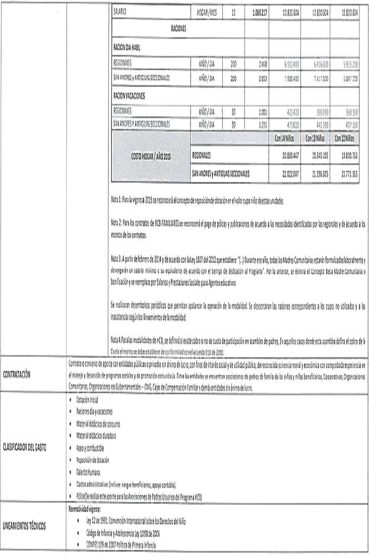| CONTRATACIÓN | Contrato o convenio de aporte con entidades públicas o privadas un ánimo de lucro, con fines de interés social y de utilidad pública, de reconocida solvencia moral y económica con comprobada experiencia en el manejo y desarrollo de programas sociales y de promoción comunitaria. Entre las entidades se encuentran asociaciones de padres usuarios de los niños y niñas beneficiarios, Cooperativas, Organizaciones Comunitarias. Organizaciones no Gubernamentales - ONG, Cajas de Compensación Familiar y demás entidades sin ánimo de lucro. | |||