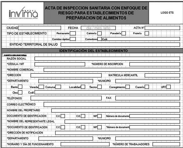 Todas las actas de inspección sanitaria con enfoque de riesgo se diseñaron con la misma estructura a saber: Identificación del establecimiento, Concepto sanitario de la última visita sanitaria, motivo de la visita, evaluación, condiciones sanitarias de instalaciones y proceso, concepto sanitario, relación de muestras tomadas en el establecimiento, requerimientos sanitarios, aplicación de medida sanitaria de seguridad, observaciones y notificación del acta.