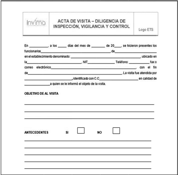 Teniendo en cuenta la disponibilidad de recursos por parte de las ETS, las actas se diseñaron en forma manual para ser diligenciadas por el inspector durante la visita de inspección sanitaria.