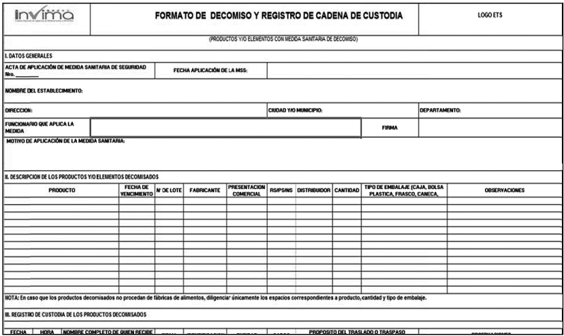 Cuando la MSS consiste en decomiso se diligencia adicionalmente el “Formato de decomiso y registro de cadena de custodia”, de acuerdo a lo establecido en la página 61 del “Manual inspección vigilancia y control sanitario de alimentos y bebidas basado en riesgo para las entidades territoriales de salud” (Documento número 25 del presente anexo técnico).