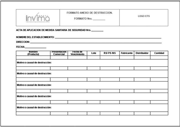 Cuando la MSS consiste en destrucción se diligencia adicionalmente el Formato anexo a destrucción, de acuerdo a lo establecido en la Figura 23 del “Manual inspección vigilancia y control sanitario de alimentos y bebidas basado en riesgo para las entidades territoriales de salud” (Documento número 25 del presente anexo técnico).
