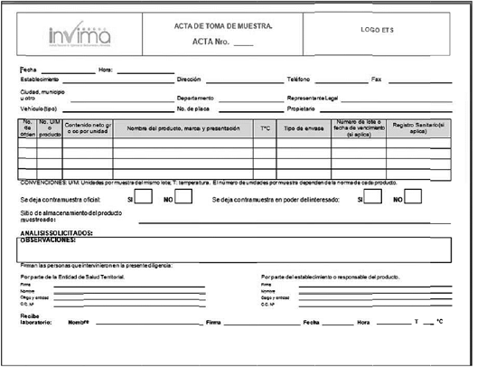 Se diseñó un ACTA DE TOMA DE MUESTRA para ser diligenciada durante las visitas de inspección sanitaria en las que a juicio del inspector se requiera realizar muestreos y también cuando se tomen muestras como resultado de los Planes de Muestreo de la ETS.