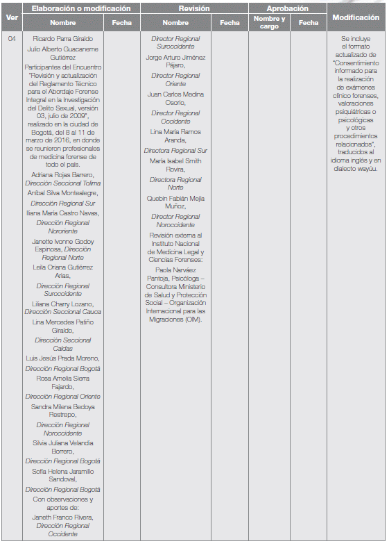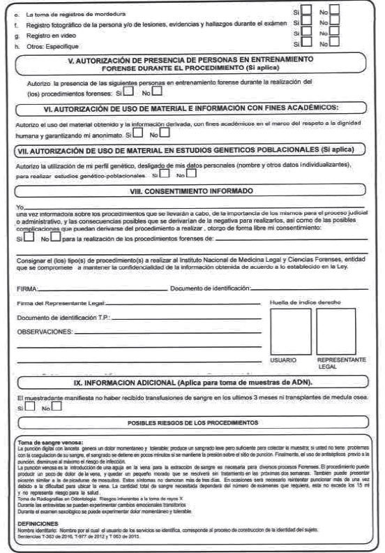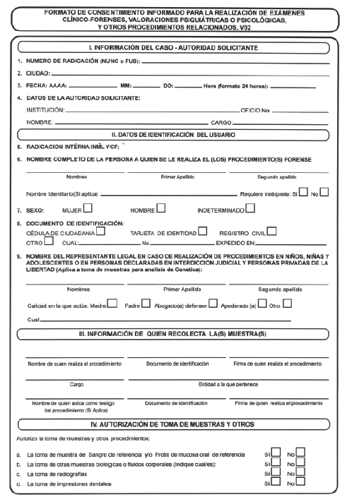 249. "Formato de Consentimiento Informado para la realizacion de examenes medicolegales y procedimientos relacionadosh, vigente, Instituto Nacional de Medicina Legal y Ciencias Forenses.