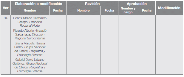 217. Consultar sobre version vigente en la pagina Web del Instituto Nacional de Medicina Legal y Ciencias Forenses, www. medicinalegal.gov.co o escribiendo al Grupo Nacional de Clinica, Psiquiatria y Psicologia Forense: dsf@medicinalegal.gov.co.