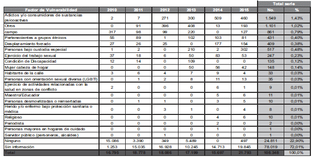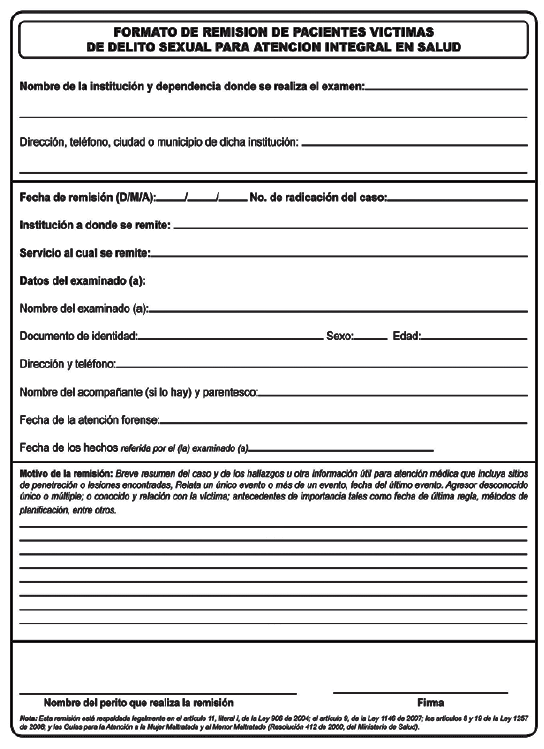 226. Articulo 9o de la Ley 1146 de 2007. Articulos 8o y 19 de la Ley 1257 de 2008. Ley 1448 de 2011. Ministerio de Salud, Resolucion 459 de 2012, Ley 1719 de 2014. Decreto 2734 de 2012.