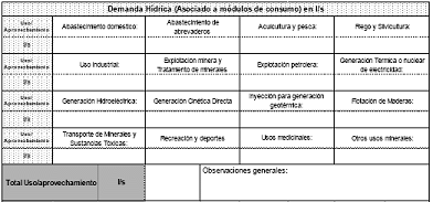 En el caso de consumo doméstico se plantea el consumo de las personas permanentes consideradas (l/s) y el consumo de personas transitorias y el estimativo del número de meses con que se efectuó el estimativo final. En el caso de abrevaderos el tipo y número de animales. En acuicultura el tipo y producción en toneladas. En riego y silvicultura el tipo, la producción en toneladas, el área cultivada y la eficiencia estimada de riego.