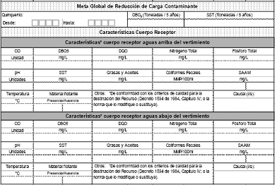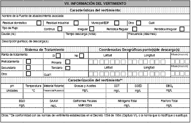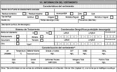 Para cada punto de descarga al cuerpo receptor, debe consignarse la información disponible sobre su localización georreferenciada (coordenadas geográficas: latitud y longitud), altura y características de la descarga, el tipo de vertimiento, la clase y el período de descarga, el número de horas del vertimiento, el caudal de vertido y el sistema de tratamiento empleado.