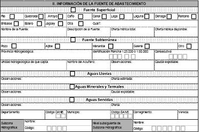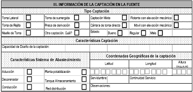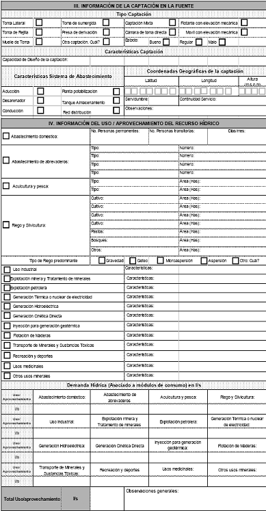 La información es requerida para cada punto de captación en la(s) fuente(s) de abastecimiento de agua que utilice el usuario. Se documenta información de localización georreferenciada, es decir latitud, longitud y altitud del sitio donde se efectúa la captación, o donde se hace la derivación relacionada con los aprovechamientos del recurso. Así mismo, las características relacionadas con los sistemas de captación, a efectos de establecer la capacidad de extracción y/o volumen total captado, capacidad y volumen de almacenamiento y régimen de operación/extracción.