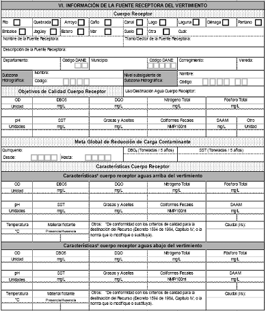 En cuanto a la calidad de la fuente receptora de vertimientos debe relacionarse información sobre los parámetros físicos, químicos disponibles en la autoridad ambiental, o los exigidos por la autoridad al usuario. Se considera pertinente abordar la calidad del cuerpo receptor en función del área aguas arriba y aguas abajo del sitio de vertimiento (zona de mezcla).