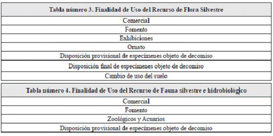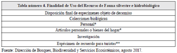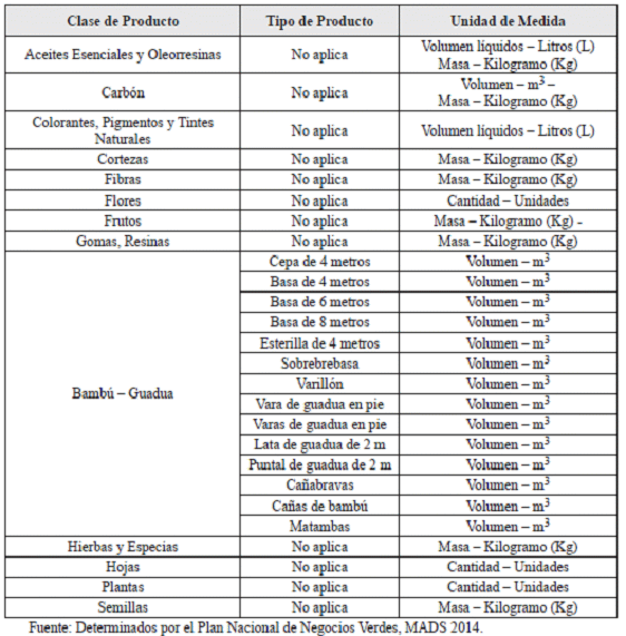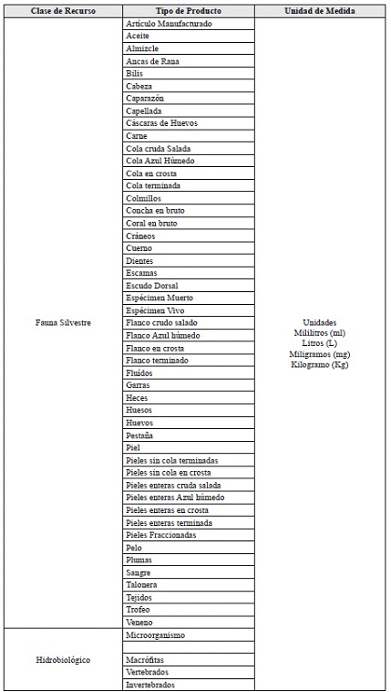 Tabla 4. Clases, tipos y unidades de medida de productos de Fauna Silvestre y Recurso Hidrobiológico