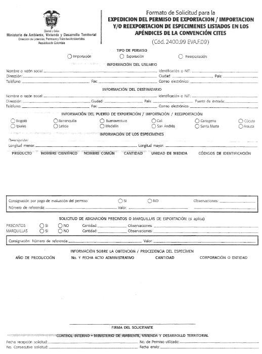 Pe rmiso CITES: Es el documento expedido por el Ministerio de Ambiente, Vivienda y Desarrollo Territorial, como autoridad administrativa en Colombia para acompañar los especímenes señalados en la Convención CITES en el momento de su importación, exportación o reexportación.