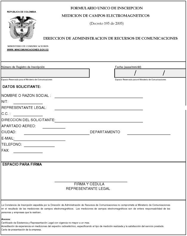 Por la cual se adopta el formulario Unico de inscripción para realizar mediciones de campos electromagnéticos, a que se refiere el artículo 13 del Decreto 195 de 2005 y se dictan otras disposiciones.
