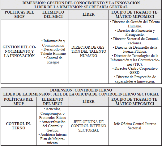 | GESTIÓN ESTRATÉGICA DEL TALENTO HUMANO | - Acuerdos, Compromisos o Protocolos éticos - Desarrollo del Talento Humano - Estructura Organizacional - Control de Riesgos | DIRECTOR GESTIÓN DEL TALENTO HUMANO | - Director de Gestión del Talento Humano. - Director de Desarrollo de la Fuerza Pública. - Director Sectorial de Bienestar y Salud. - Obispo Castrense de Colombia. |