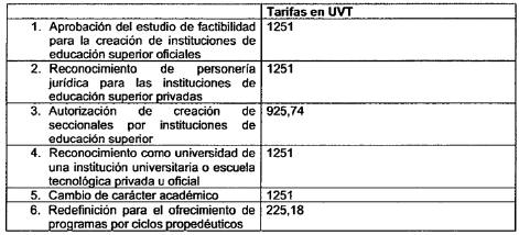ARTÍCULO 11. CONVERSIÓN A UVT DE TARIFAS DE ESTUDIOS CONDUCENTES A LA CREACIÓN DE INSTITUCIONES DE EDUCACIÓN SUPERIOR. Fíjense así las tarifas por concepto de estudios conducentes a la creación de instituciones de educación superior oficiales, reconocimientos de personería jurídica de las instituciones privadas de educación superior, autorización de creación de seccionales, reconocimiento institucional como universidad, modificación del carácter académico, y redefinición para el ofrecimiento de programas por ciclos propedéuticos: