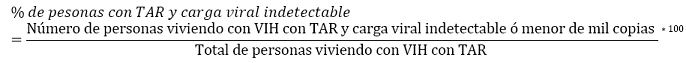 Mide: Este indicador mide el número de personas con diagnóstico confirmado de VIH/SIDA y que se encuentran en TAR, con última carga viral adecuada.