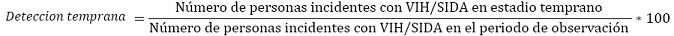 Numerador: Base de datos de VIH/SIDA, del Fondo Colombiano de Enfermedades de Alto Costo, pacientes con nuevo diagnóstico confirmado en la misma entidad que lo reporta en estadio temprano de la enfermedad al momento del diagnóstico (estadios A1,B1, A2 o B2 del CDC 1993).