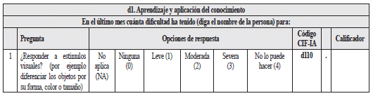 a) Las preguntas D1.1; D6.2; D6.3 evalúan dos códigos CIF cada una. En este caso se deben registrar los dos códigos evaluados por la pregunta asignando a cada uno el calificador de la pregunta respectiva. Así, la pregunta D6.2. Evalúa los códigos e150. (Diseño, construcción y materiales de construcción de tecnología arquitectónica para edificios de uso público) y e155. (Diseño, construcción y materiales de construcción de tecnología arquitectónica para edificios de uso privado). Si ante la pregunta el entrevistado responde que tiene una dificultad moderada debida a las barreras u obstáculos existentes en el mundo que lo rodea, se asignará a la pregunta el calificador 2 en la hoja de respuestas, y se registrarán los códigos CIF e150.2 y e155.2 en el perfil de funcionamiento.