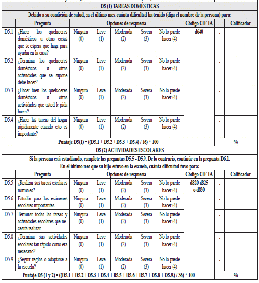 b) Las cuatro preguntas del dominio D5(1) tareas domésticas, evalúan diferentes aspectos del código CIF d640. (Realizar los quehaceres de la casa). Para registrar el código CIF en el formato de perfil de funcionamiento se debe registrar el calificador de la pregunta que se haya puntuado más alto. Así, si la pregunta D5.1 tiene un calificador 1, la pregunta D5.2 tiene un calificador 3, la pregunta D5.3 tiene un calificador 2 y la pregunta D5.4 tiene un calificador 1, el código CIF se registrará como d640.3, por ser 3 el calificador más alto entre las cuatro preguntas del dominio.