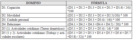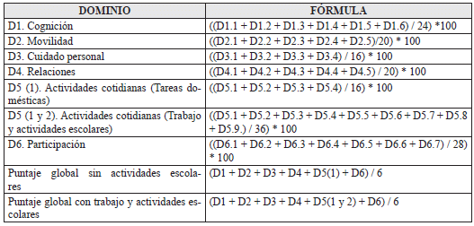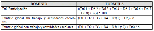 El cálculo del puntaje de cada dominio y el puntaje global del instrumento, se realiza mediante la aplicación de las fórmulas definidas en la tabla “Fórmulas para la calificación del instrumento para personas de 6 a 17 años” (tabla 10), donde D1 representa el dominio 1, D2 representa el dominio 2, y así sucesivamente. D1.1. representa el calificador de la primera pregunta del dominio 1, D1.2 representa el calificador de la segunda pregunta del dominio 1, D2.3 representa el calificador de la tercera pregunta del dominio 2, y así sucesivamente.