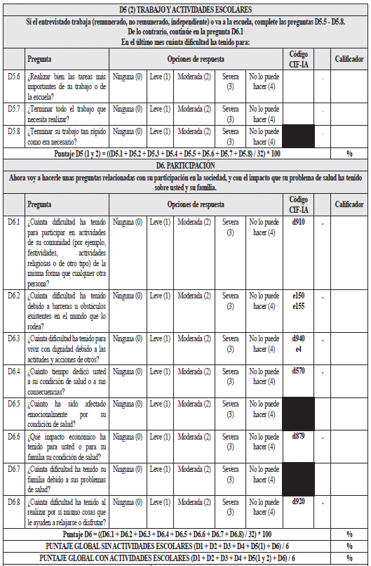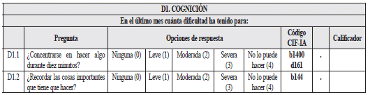 - Las preguntas D6.3, D6.4., D6.5 y D6.6 no cuentan con código CIF por evaluar factores personales, que no están codificados en la clasificación de la CIF.