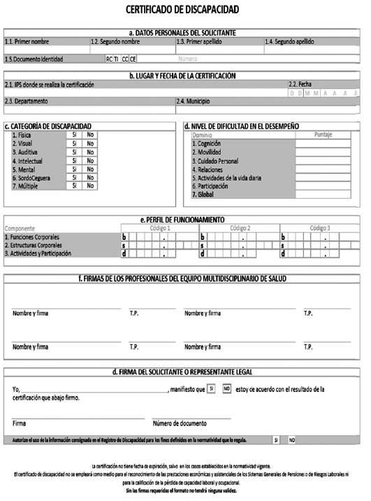 Nota. El certificado deberá contener la siguiente nota aclaratoria: “Este certificado no requiere actualización, salvo en los casos establecidos en la normatividad vigente. El certificado de discapacidad no se empleará como medio para el reconocimiento de las prestaciones económicas y asistenciales de los Sistemas Generales de Pensiones o de Riesgos Laborales ni para la calificación de la pérdida de capacidad laboral y ocupacional. Sin las firmas requeridas el certificado de discapacidad no tendrá validez”.