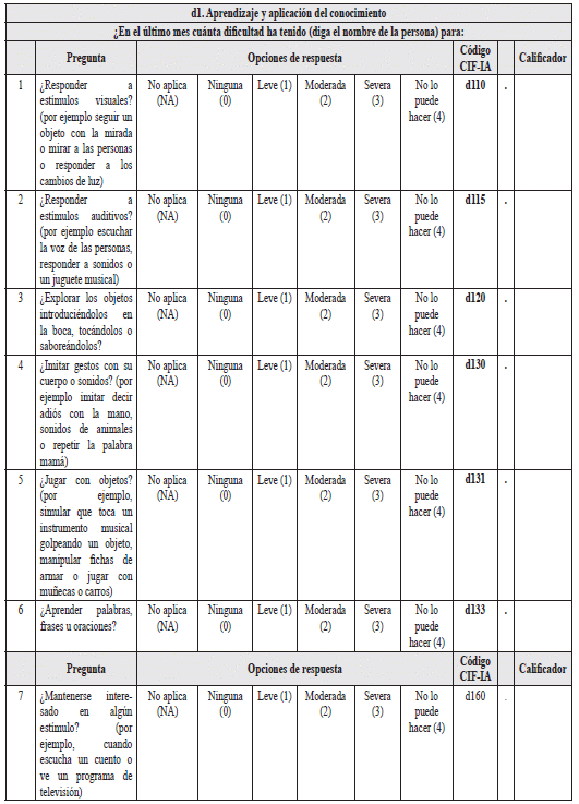 - Las cuatro preguntas del dominio D5 (2), actividades escolares, evalúan diferentes aspectos de las actividades educativas. La elección del código depende del nivel educativo al que actualmente asiste la persona valorada. El código CIF d819. Corresponde a educación escolar, el código d825. Corresponde a formación técnica o tecnológica, y el código d830. Corresponde a educación superior. Adicionalmente, para registrar el código CIF en el formato de perfil de funcionamiento se debe registrar el calificador de la pregunta que se haya puntuado más alto. Así, por ejemplo, si la persona asiste a la universidad, y la pregunta D5.5 tiene un calificador 1, la pregunta D5.6 tiene un calificador 3, la pregunta D5.7 tiene un calificador 2, la pregunta D5.8 tiene un calificador 1, y la pregunta D5.9 tiene un calificador 0, el código CIF se registrará como d830.3, por estar cursando educación superior y por ser 3 el calificador más alto entre las cinco preguntas del dominio.