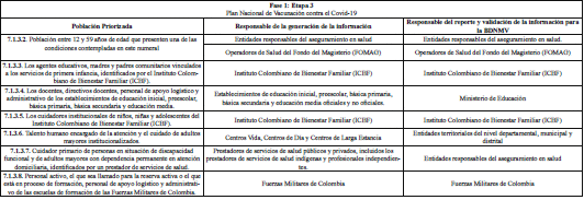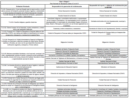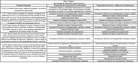 Que, la citada norma establece que, el Plan Nacional de Vacunación está integrado por 2 fases y 5 etapas, y que este Ministerio será el encargado de identificar las personas a vacunar en cada etapa, así como de conformar gradualmente la Base de Datos Maestra de Vacunación Nominal, de acuerdo con la información contenida en las bases de datos oficiales con las que cuenta el Estado colombiano y aquellas que estén disponibles; así mismo dispuso que para la identificación nominal de algunos grupos poblacionales priorizados de los cuales el Ministerio no disponga de información, este solicitará a las entidades públicas o privadas la entrega de la información correspondiente, mediante los mecanismos electrónicos que defina, precisando que la completitud, oportunidad y calidad de los datos suministrados por esas entidades será responsabilidad de las mismas, quienes deberán disponer de un mecanismo de consulta para que la población pueda solicitar la revisión de su caso, si lo considera necesario.