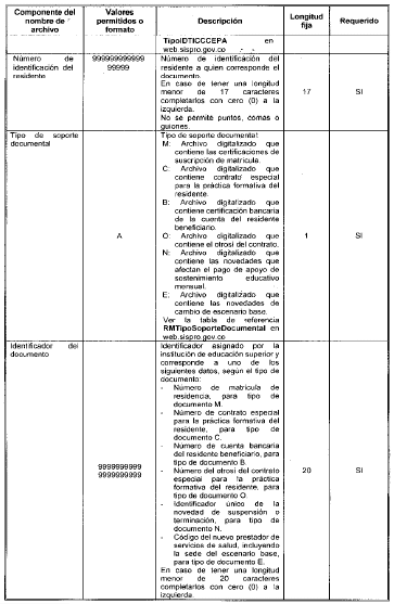 Las instituciones de educación superior con programas de especialización médico-quirúrgica deberán reportar al Ministerio de Salud y Protección Social, en formato PDF, los documentos de inscripción del residente beneficiario, esto es, soporte de la matrícula, contrato especial para la práctica formativa del residente, certificación de la cuenta bancaria y soportes de novedades, de acuerdo con la estructura y especificaciones técnicas definidas en este anexo.