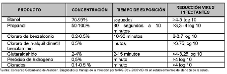 A continuación, se describe la concentración, los tiempos de exposición requeridos y la reducción del virus infectante: