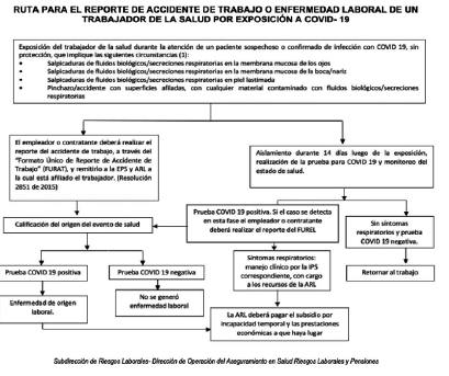 Una vez se genere el reporte, bien sea como accidente de trabajo o como enfermedad laboral, los actores involucrados deben desplegar inmediata y efectivamente los mecanismos de protección de los trabajadores de la salud, teniendo en cuenta el siguiente algoritmo, con el fin de que el trabajador reciba las prestaciones económicas y asistenciales a las que haya lugar en el marco de los Sistemas General de Seguridad Social en Salud y Riesgos Laborales.