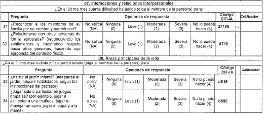 En este apartado, el aplicativo web del RLCPD presenta una tabla denominada "nivel de dificultad en el desempeño” para escribir el valor de la puntuación de cada dominio, con el propósito de compilar los resultados del instrumento en un solo espacio, facilitando el manejo posterior de la Información. Estos resultados se verán reflejados en el apartado denominado “nivel de dificultad en el desempeño" del certificado de discapacidad.