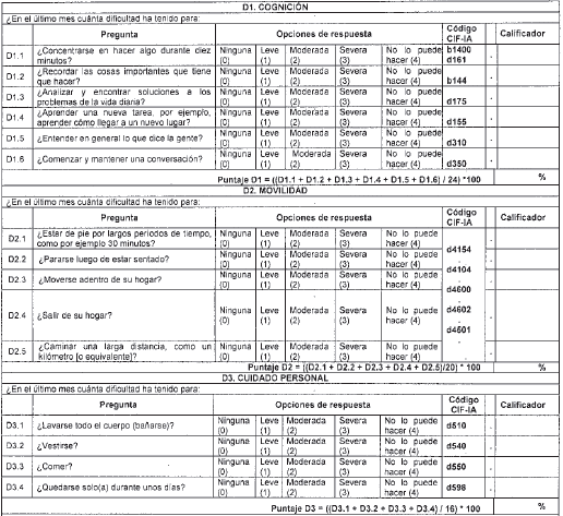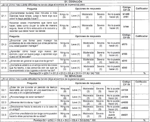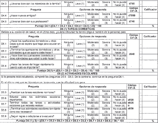 | D5 (1 y 2). Actividades cotidianas (Trabajo y actividades escolares) | ((D5.1 + D5.2 + D5.3 + D5.4 + D5.5 + D5.6 + D5.7 +D5.8) / 32)) *100 |