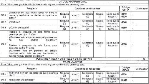 | D3 Cuidado personal | ((D3.1 + D3.2 + D3.3 + D3.4) / 16* 100 |
