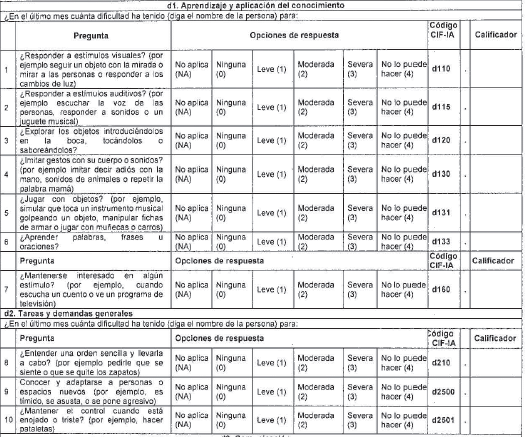 d. Nivel de dificultad en el desempeño. Porcentaje expresado en una escala de 0 a 100 por cada uno de los siguientes dominios de actividades y participación.