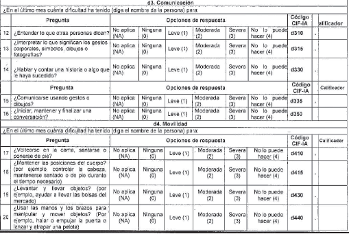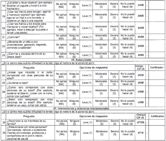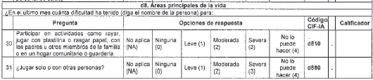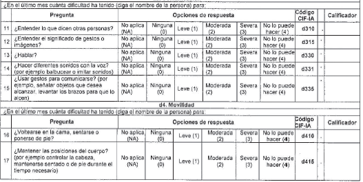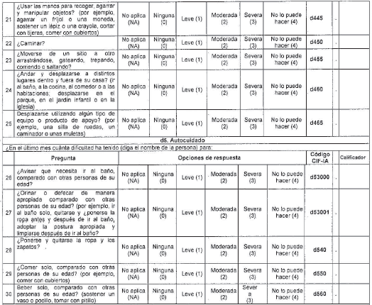 - Por favor píense en el último mes y responda estas preguntas considerando cuánta dificultad ha tenido (diga el nombre de la persona) al llevar a cabo las siguientes actividades