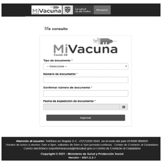La consulta individual a la plataforma MIVACUNA COVID-19 se realizará en el enlace https://mivacuna.sispro.gov.co/MiVacuna?v1