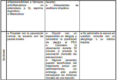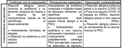 - Un historial de anafilaxia a cualquier otra vacuna o terapia inyectable (es decir, vacunas o terapias intramusculares, intravenosas o subcutáneas) se considera una precaución, pero no una contraindicación para la vacunación. Para estas personas, un profesional de la salud con experiencia especializada en trastornos alérgicos debe realizar una evaluación de riesgos. Estas personas aún pueden recibir la vacuna. Aún es incierto si existe un mayor riesgo de anafilaxia, pero deben ser asesorados sobre el riesgo potencial de anafilaxia y los riesgos deben sopesarse con los beneficios de la vacunación. Estas personas deben ser observadas durante 30 minutos después de la vacunación en entornos de atención médica donde la anafilaxia se puede tratar de inmediato.