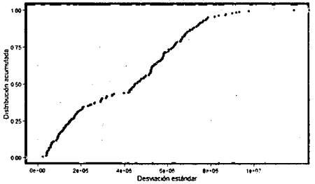 Por su parte la gráfica 2 muestra la distribución acumulada de la dispersión medida como desviación estándar. Se observa que alrededor de 4 millones de pesos hay un cambio de pendiente, lo cual se asocia a mayor volatilidad de los datos después de dicho umbral.